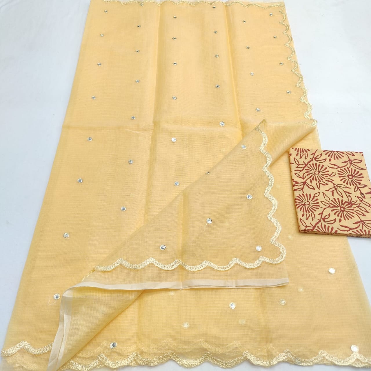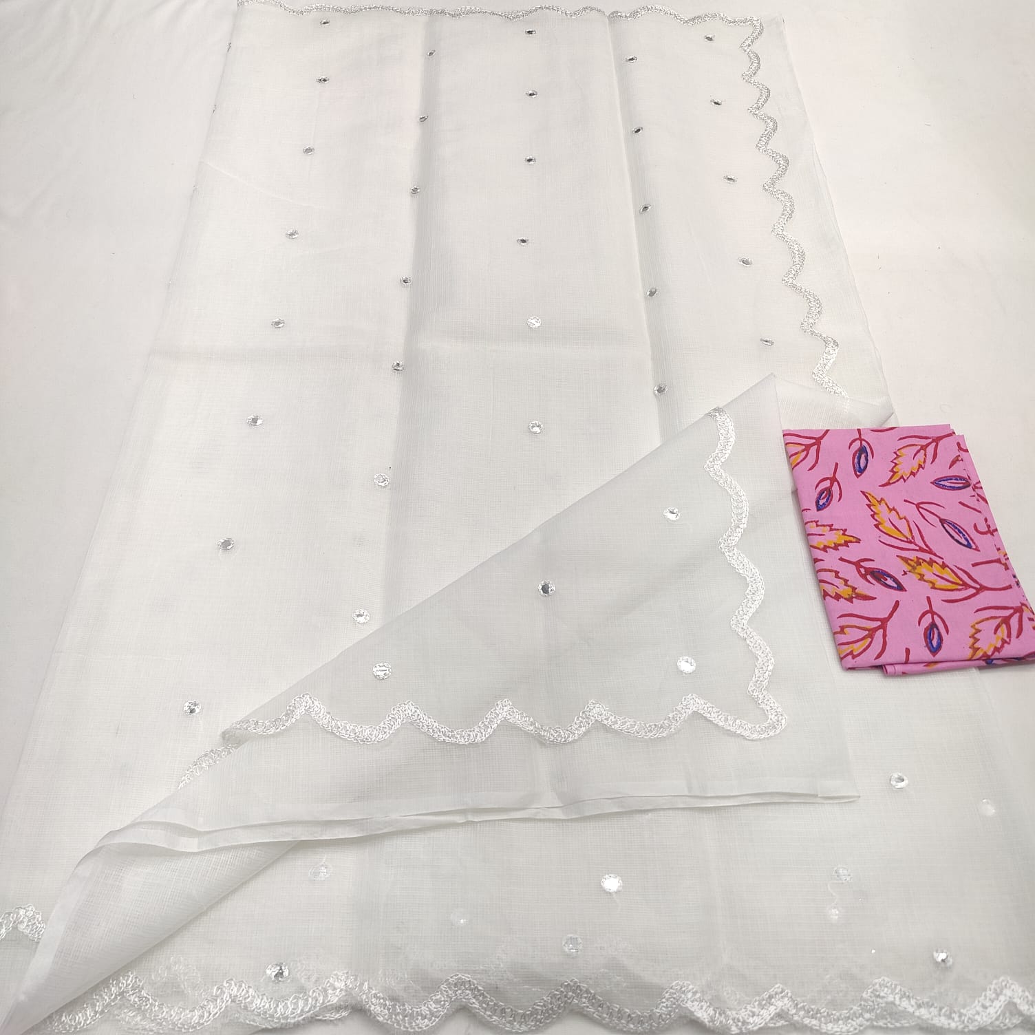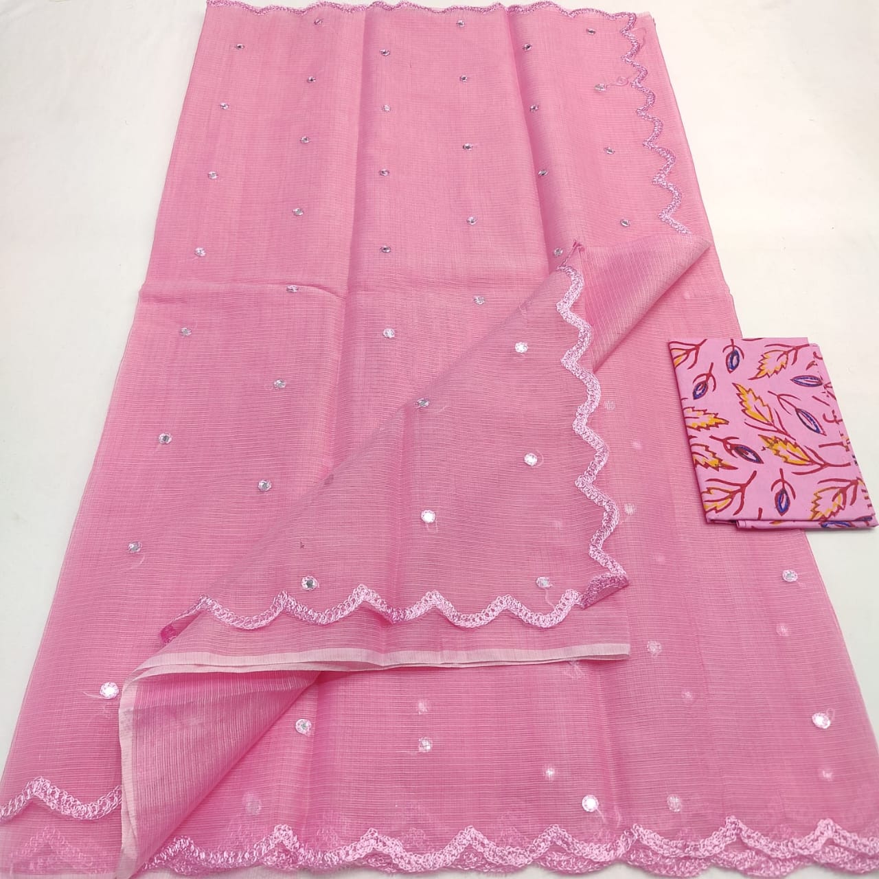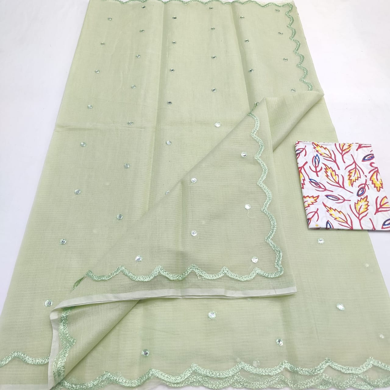 A pastel Kota Doria saree with elegant mirror Aari work, blending the finesse of Kota mixed cotton with festive charm. Available in 9 colours.