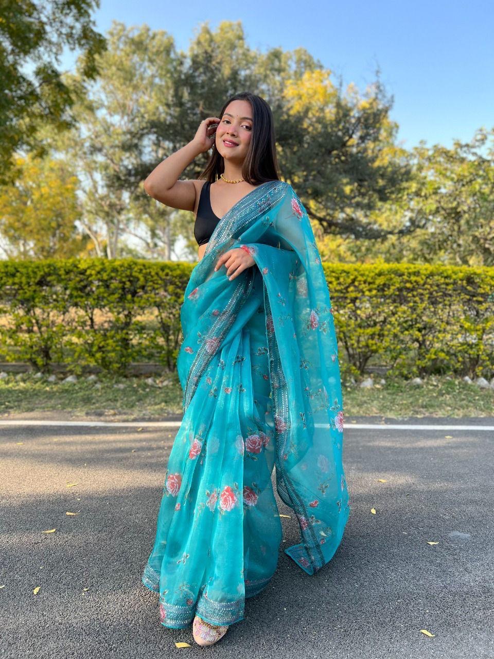 Floral Digital Printed Sequins Border Work Designer organza saree