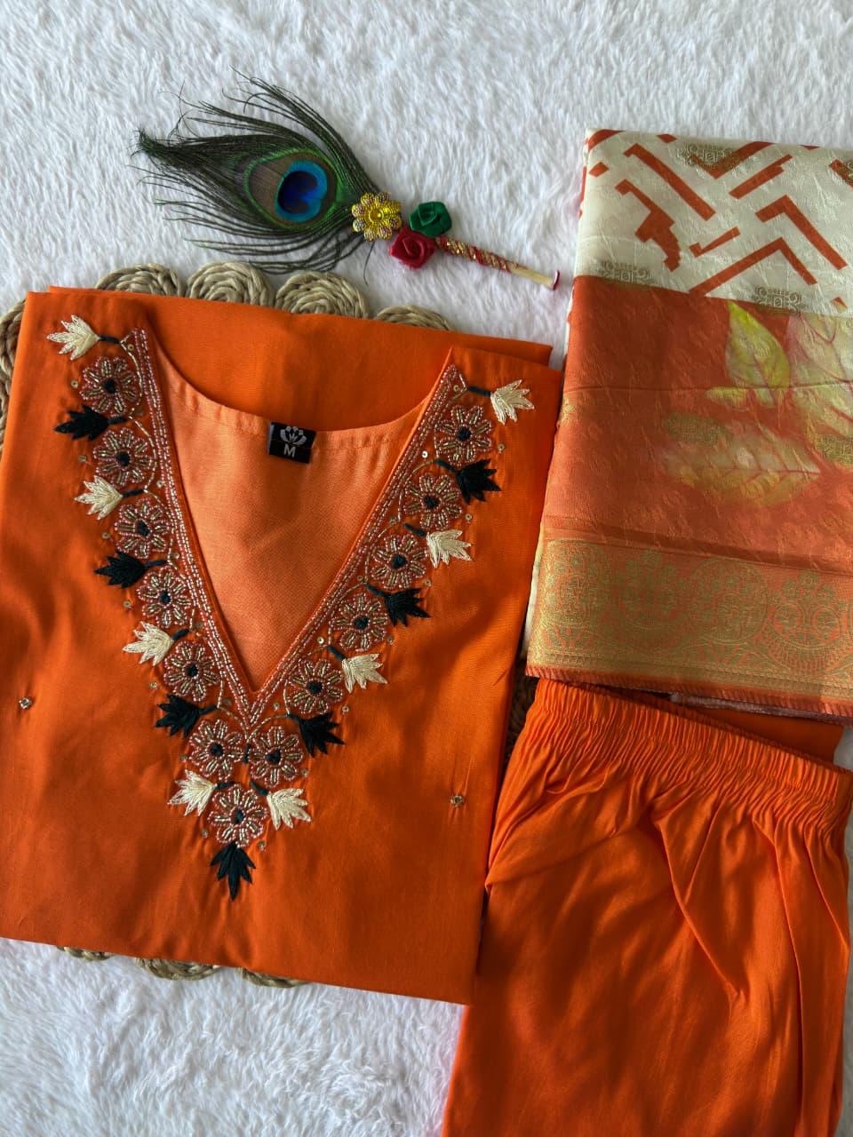 A classy kurti set made with premium quality Roman Silk, perfect for casual outings with beautiful handwork design