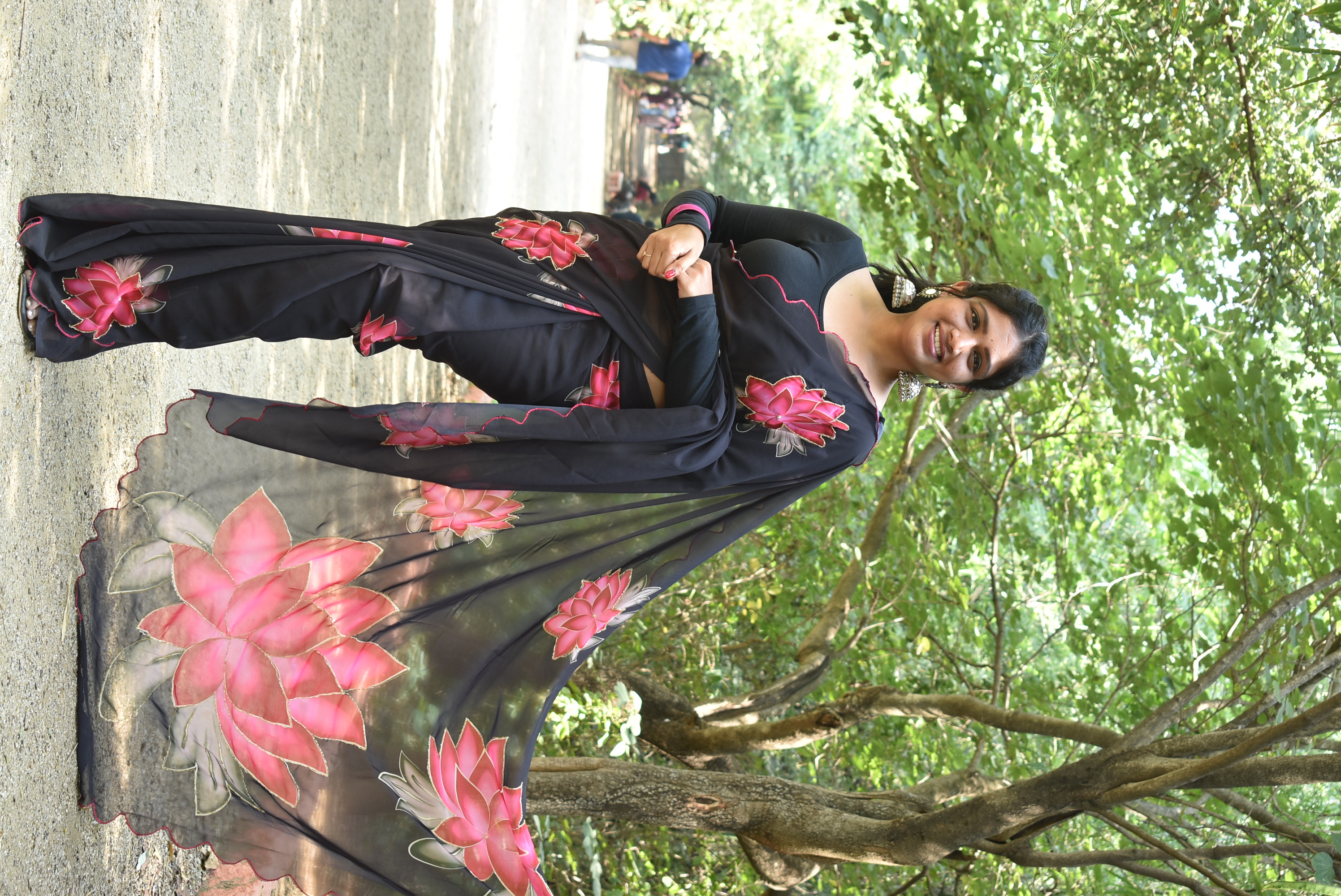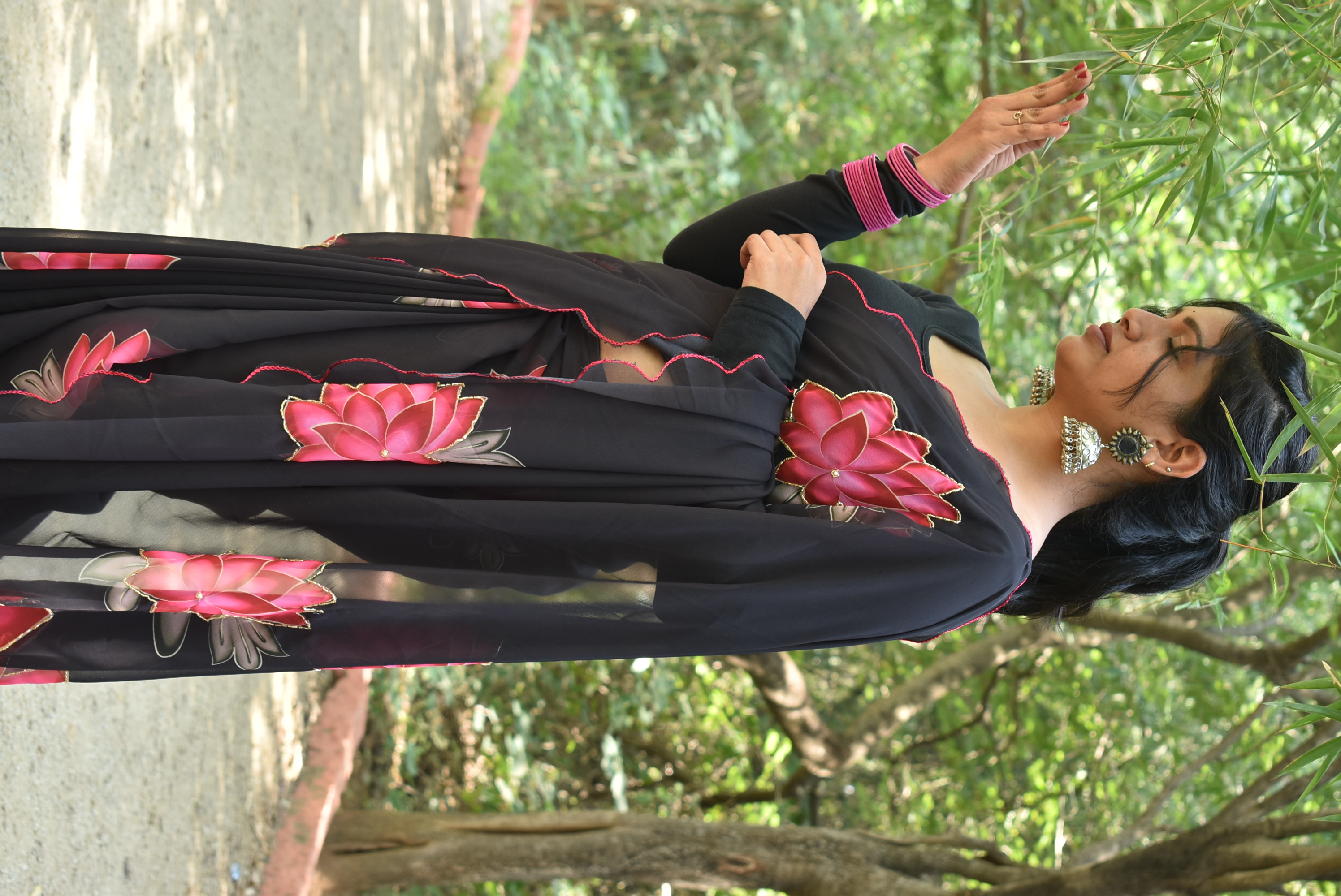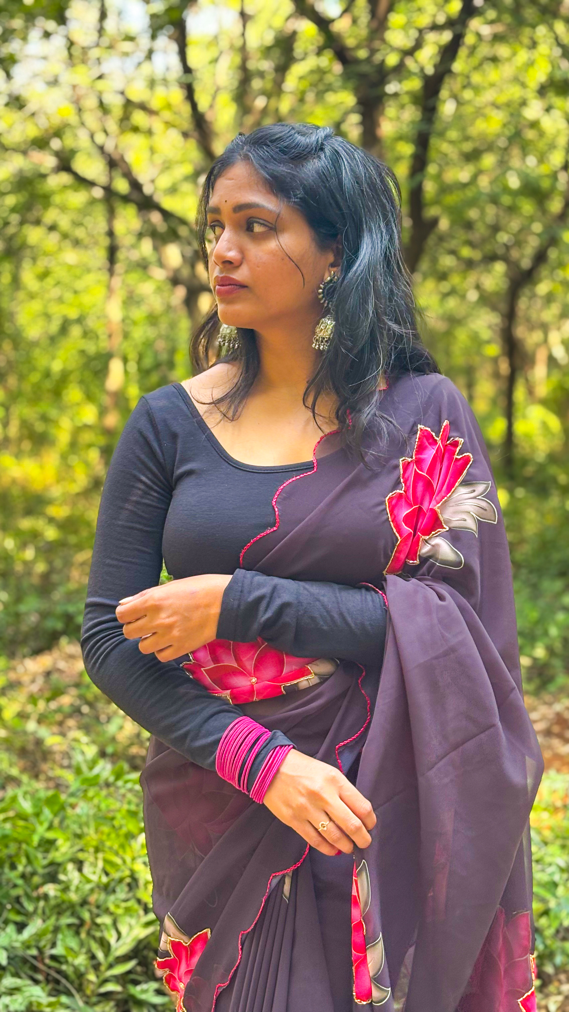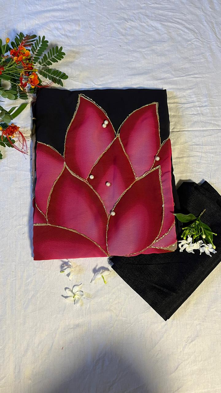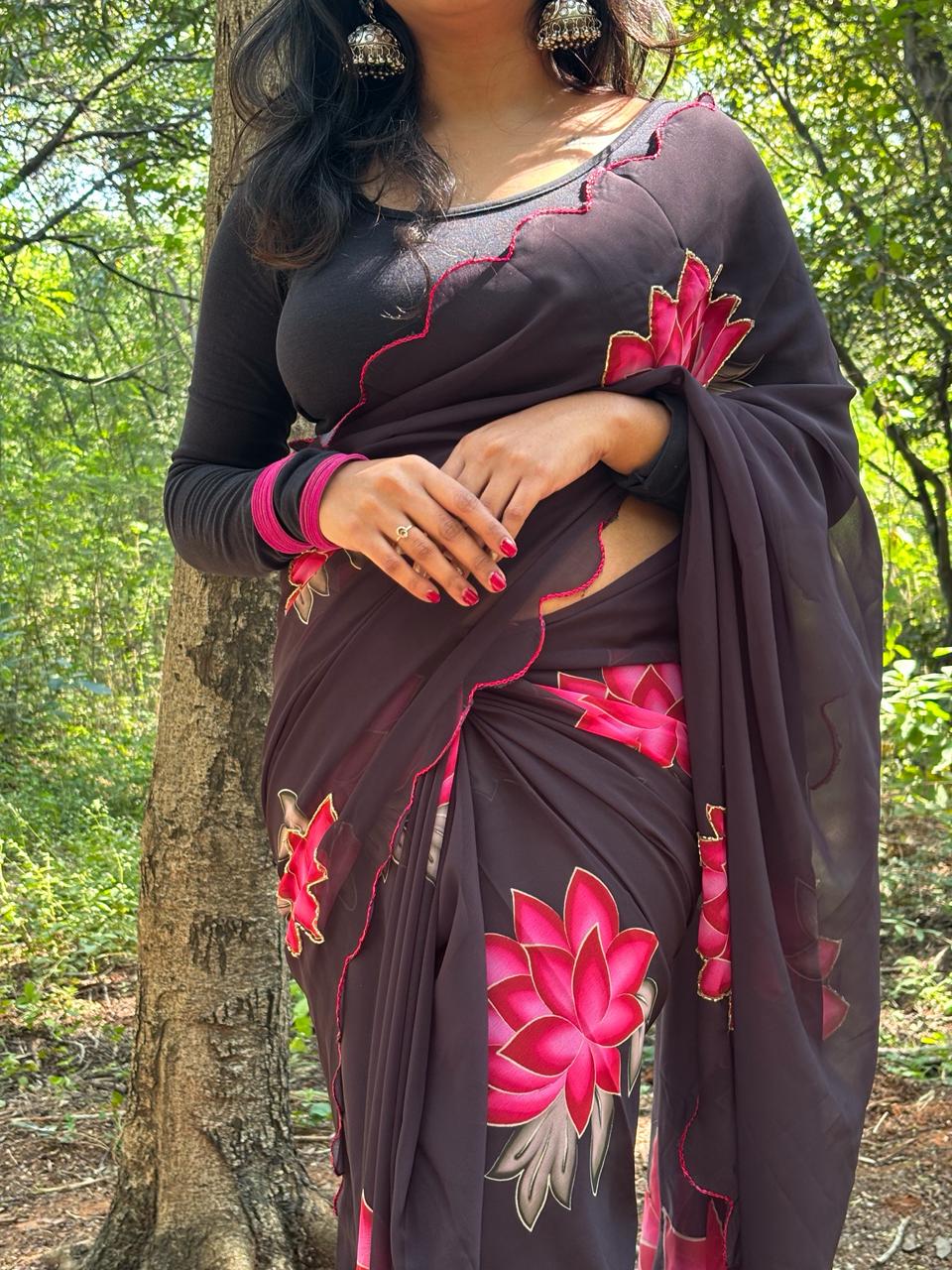 A soft pure georgette saree with an all-over digital print, accented with delicate Khatli handwork and fancy Arri work. Comes with a Bangalore satin blouse.