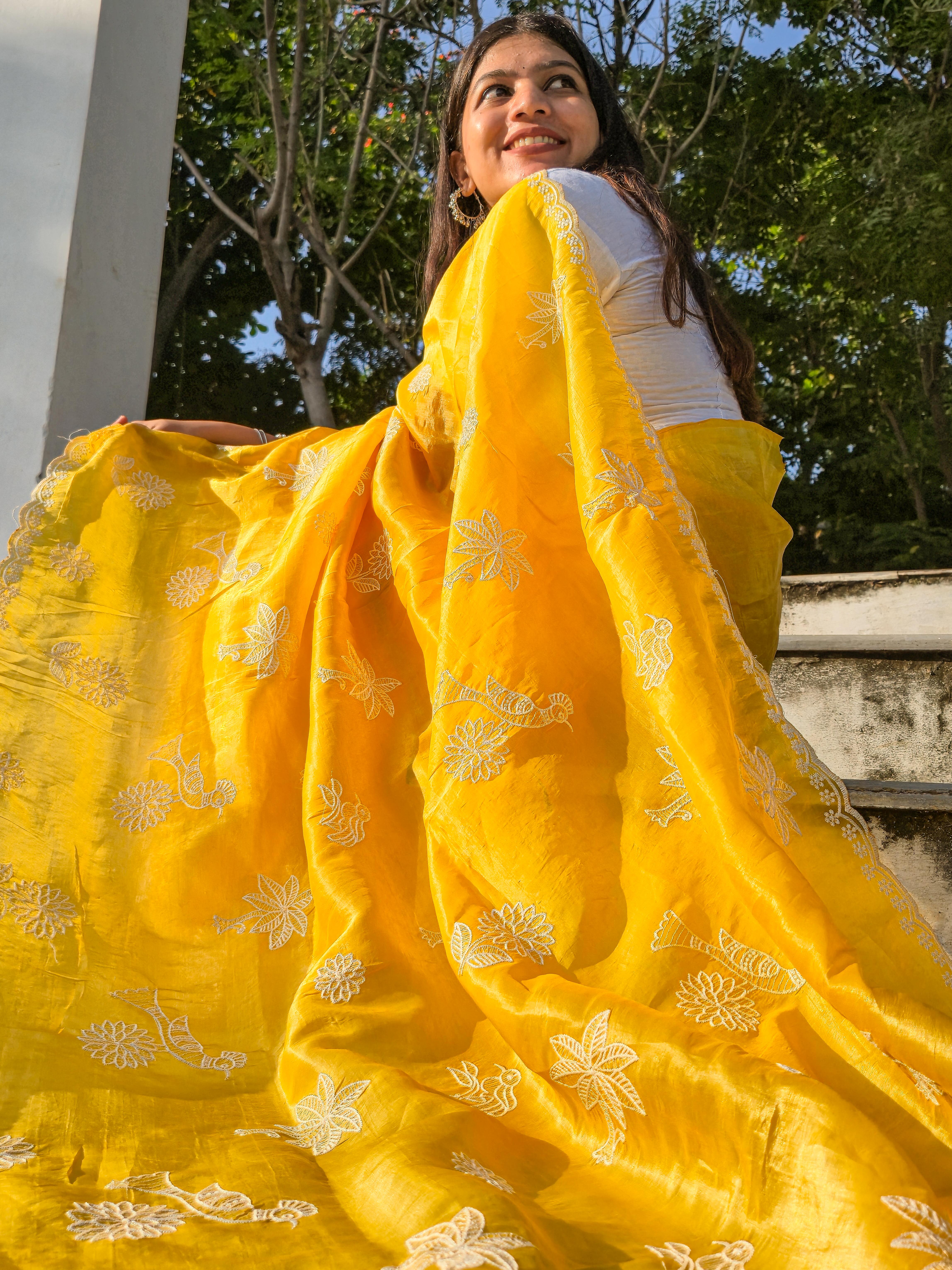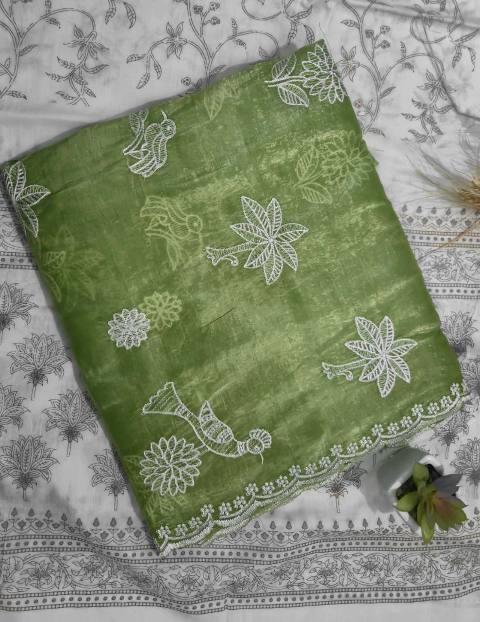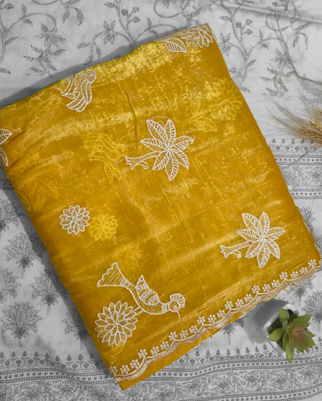 An elegant tissue organza saree with white thread woven embroidery and a beautifully finished border. Paired with a blouse featuring a minimal embroidery design. Available in 4 colours.