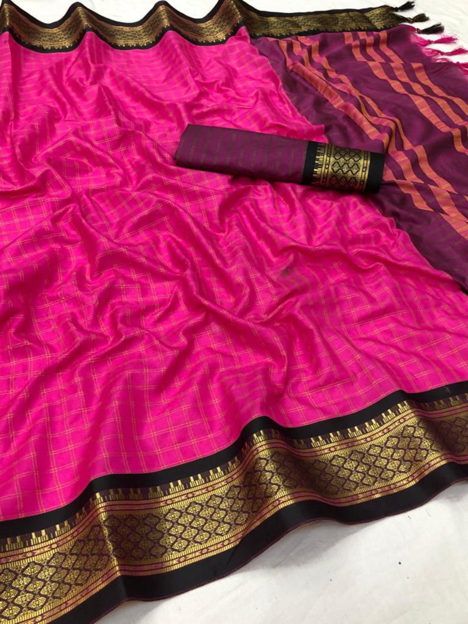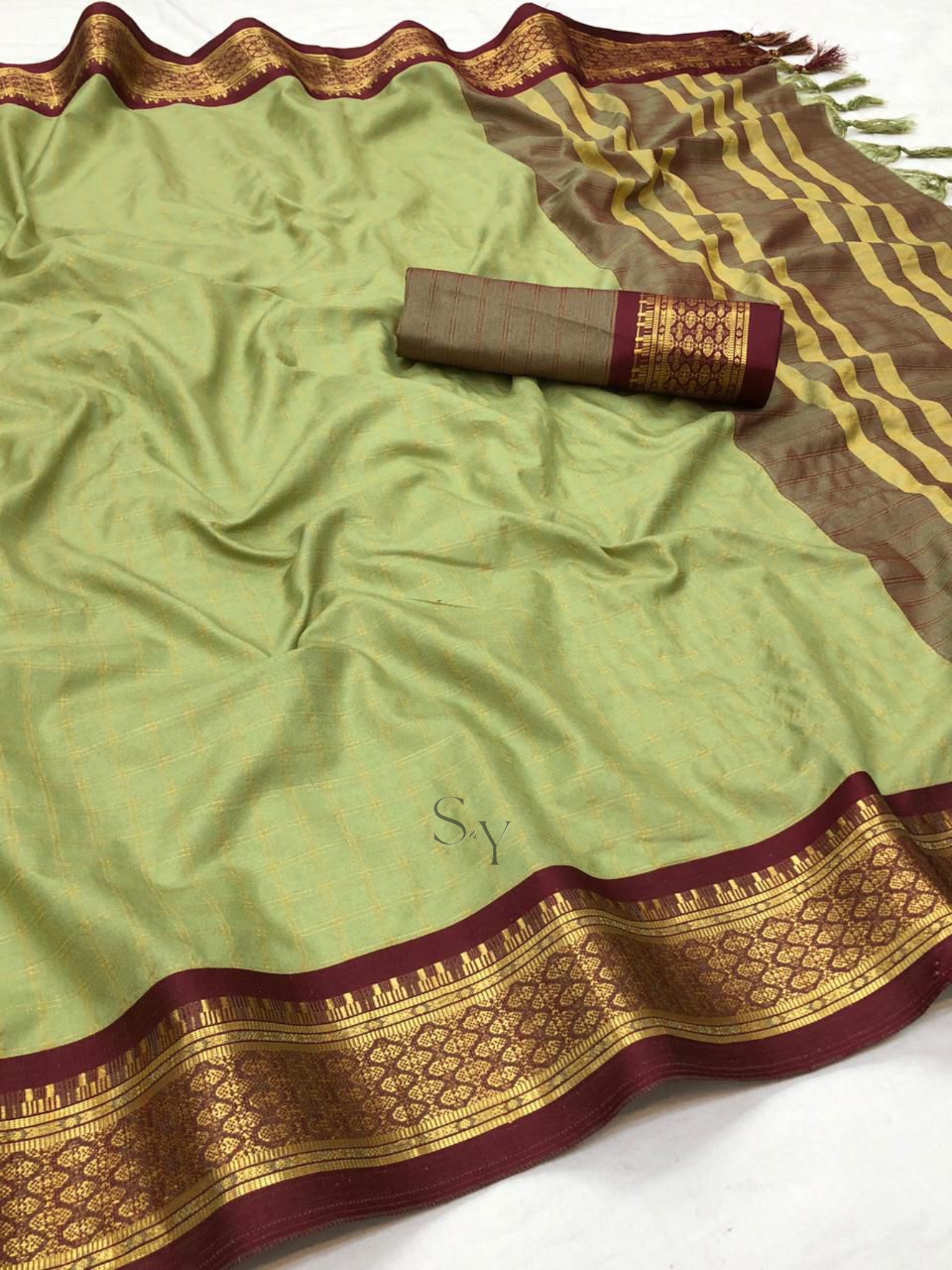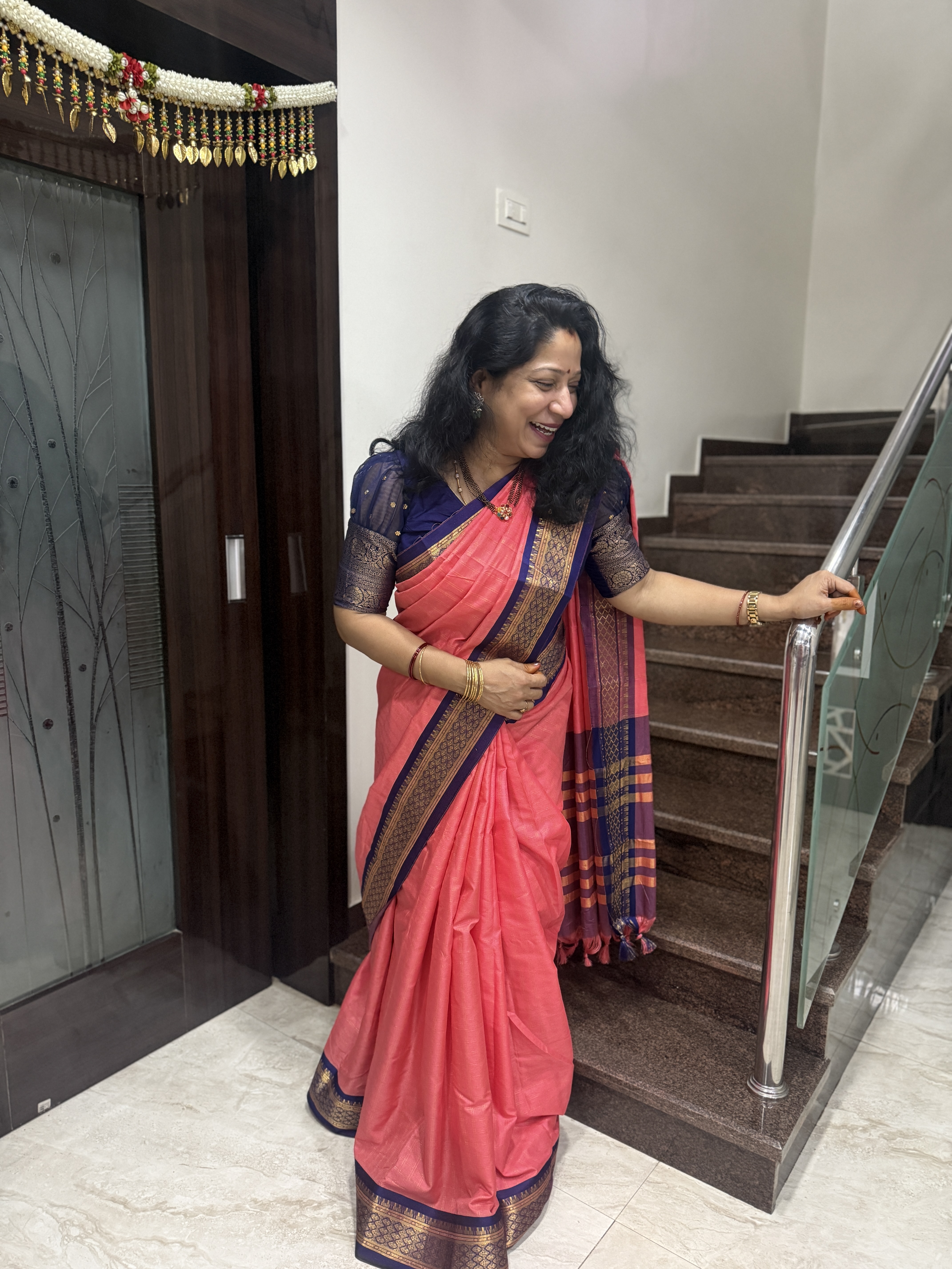 A rich heavy cotton silk saree in the iconic Kanjivaram style with a distinctive Chit Pallu concept. Versatile enough for both festive and casual occasions.