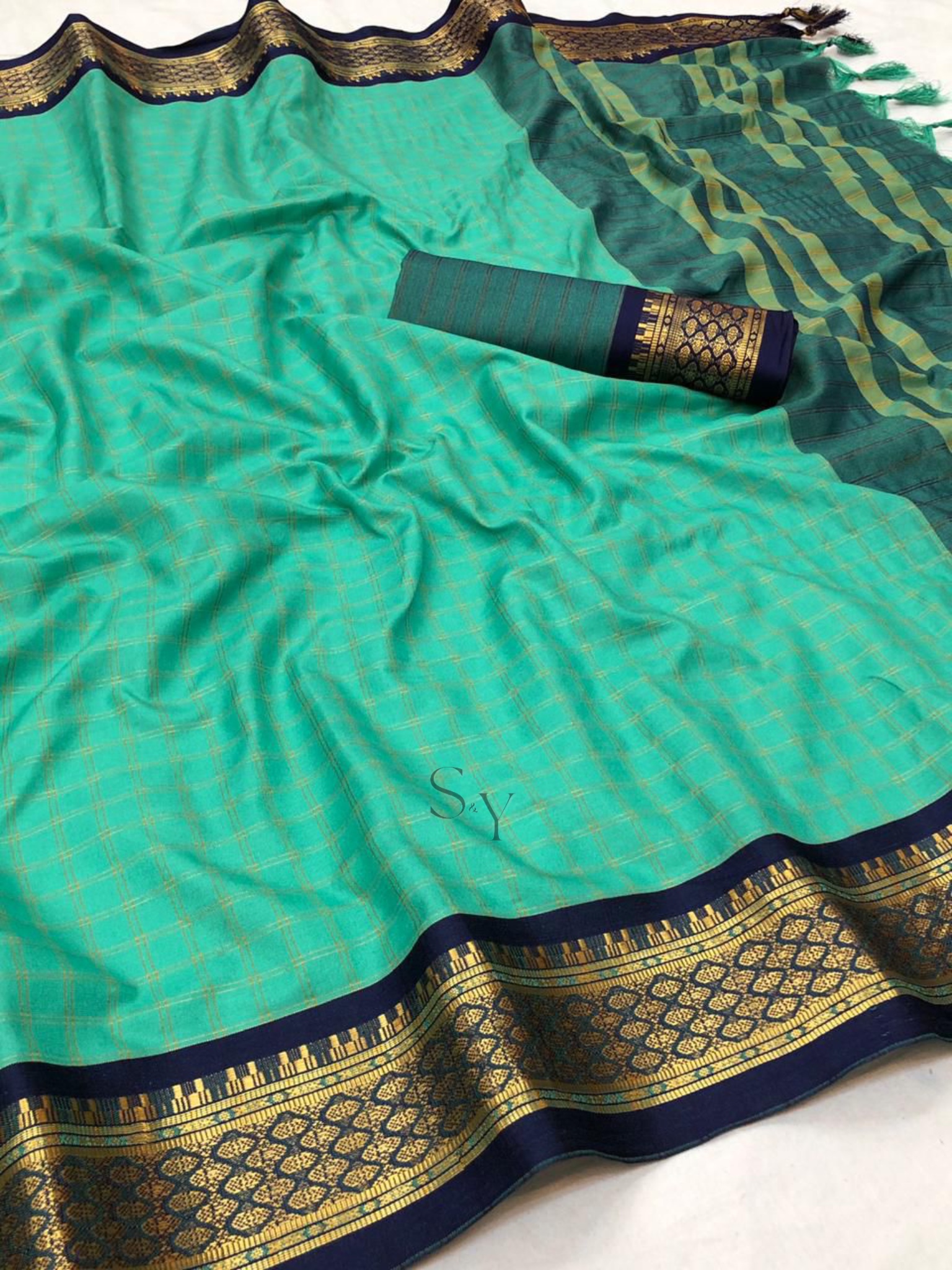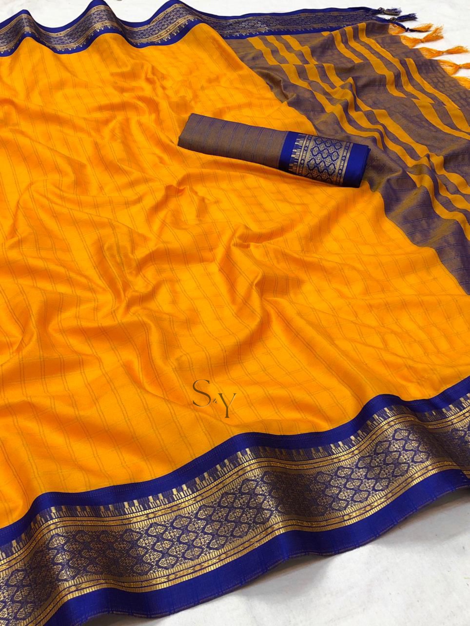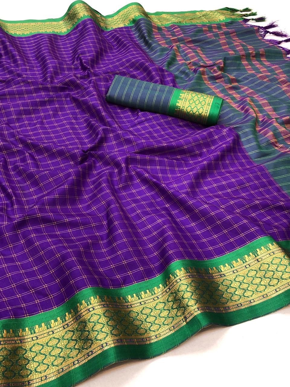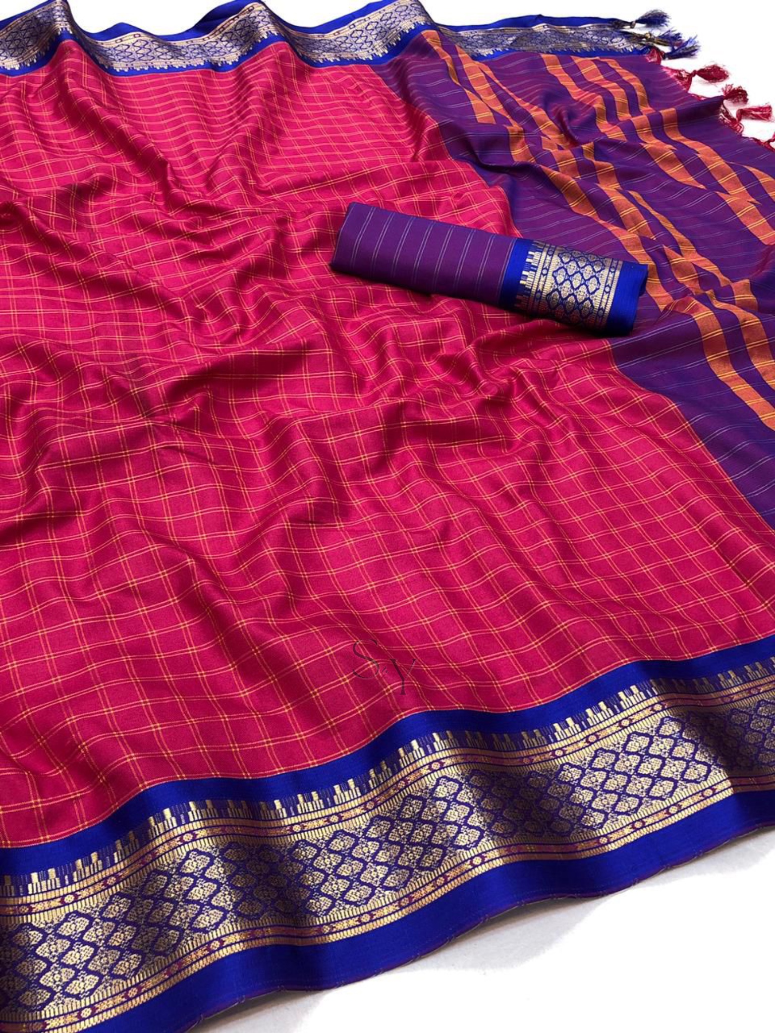 A rich heavy cotton silk saree in the iconic Kanjivaram style with a distinctive Chit Pallu concept. Versatile enough for both festive and casual occasions.